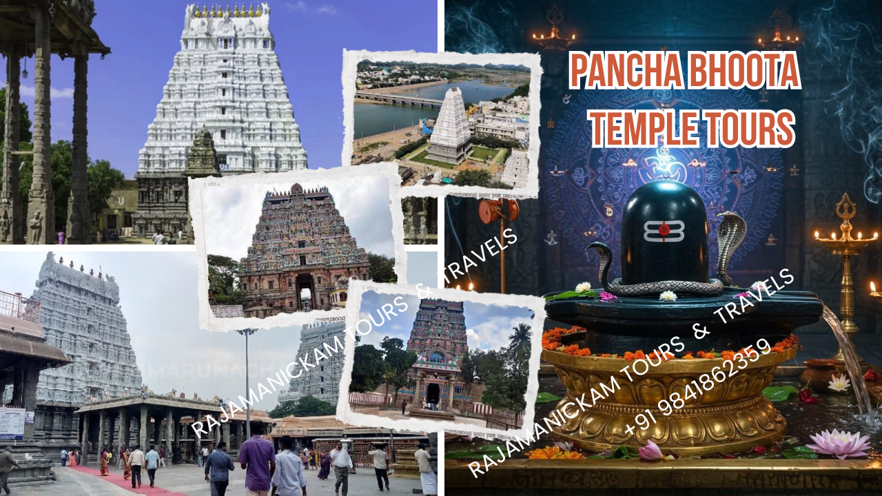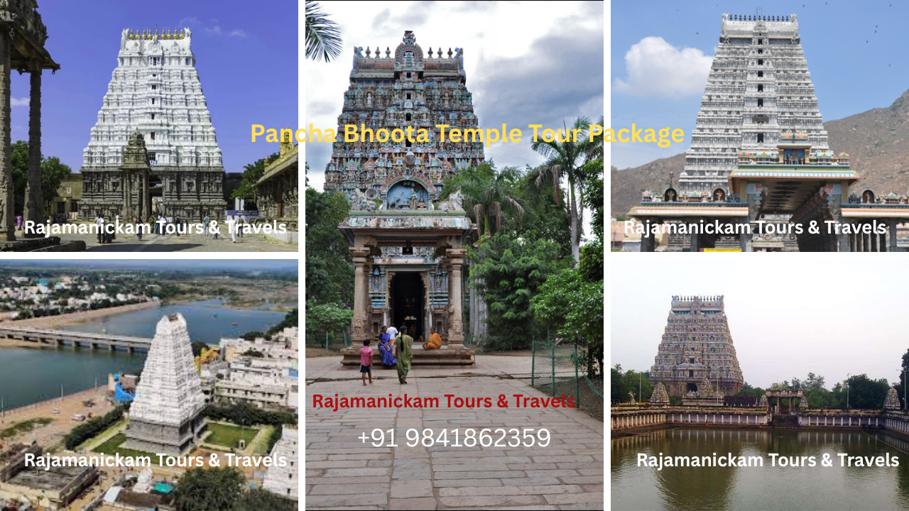 Lord Shiva’s Pancha Bootha Sthalam feature four temples in Tamil Nadu. The fifth sits at Srikalahasti in Andhra Pradesh. At pancha Bhoota Sthalangal Tour package Arranged for Best tours Operator With Rajamanickam Tours and Travels. Further Any Deals of Pancha Bhoota Sthalam Temples Tour package from Chennai, Bangalore, Tirupati, Trichy , Rameshwaram and Many More Cities in Tamilnadu Pl Call Us or whatsapp Chat at +91 9841862359 | +91 9176070718